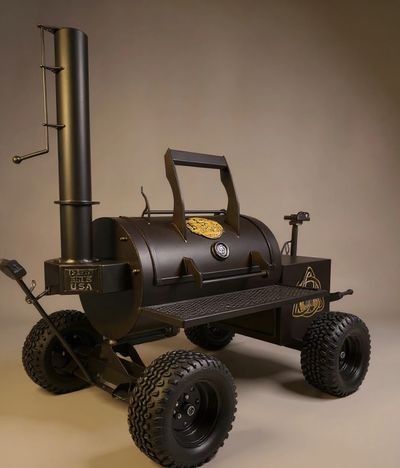 As shown above with the optional upper cook rack, Off-road package with wagon tow, fully insulated square double-wall firebox and the clear finish.